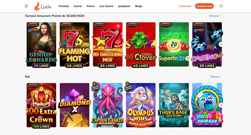 Nu ai cum să te plictisești pe site-ul Luck Casino din România, pentru că ai la dispoziție 4.900 de titluri diferite de jocuri de noroc, exceptând secțiunea de Bingo și Pariuri Sportive. Experiența începe cu jocurile care participă la turnee, cele de cazinou apoi cele live.