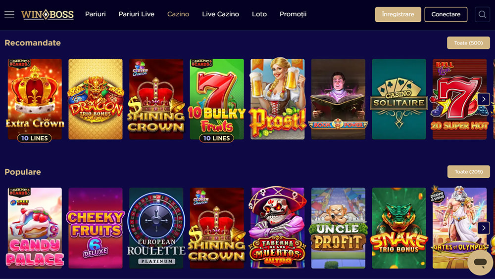 Pentru recenzia cazinoului WinBoss am început cu selecția de jocuri. Aceasta este impresionantă, cu peste 4.600 de jocuri de la peste 70 de furnizori. Firesc, având în vedere selecția uriașă de titluri, jocurile sunt împărțite în mai multe categorii relevante: Recomandate, Noi, Populare, Megaways, Bonus Buy, Trending, Păcănele cu fructe.